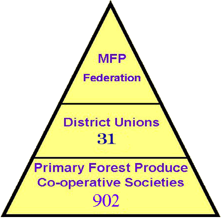 Chhattisgarh State Minor Forest Produce (Trading and Development) Co-operative Federation Limited is an apex organization with three tier co-operative structure comprising of an state level Apex body, 31 District Unions and 902 Primary Forest Produce Co-operative Societies. At present there are about 10671 collection centres (called Phads) of Tendu leaves spread over the length and breadth of the state and approximately 13.50 lakhs Minor Forest Produce gatherer families. Federation is responsible for all aspects relating to management, development and trade of minor forest produce sector in the state.